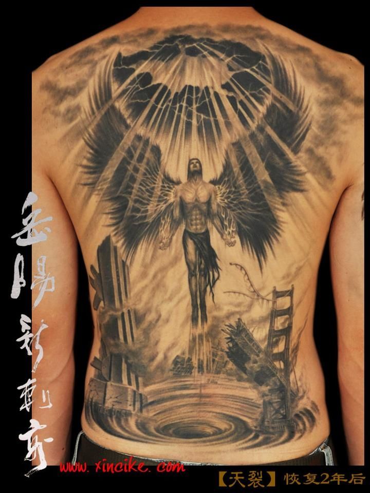 El ángel del apocalipsis, no es exactamente el tatuaje de un ángel guardián pero al verlo me ha gustado tanto que he querido que forme parte de esta galería de tatuajes espectaculares, en realidad la figura del ángel exterminador es recurrente en los temas mas tatuador por los amantes de este género de diseños.
