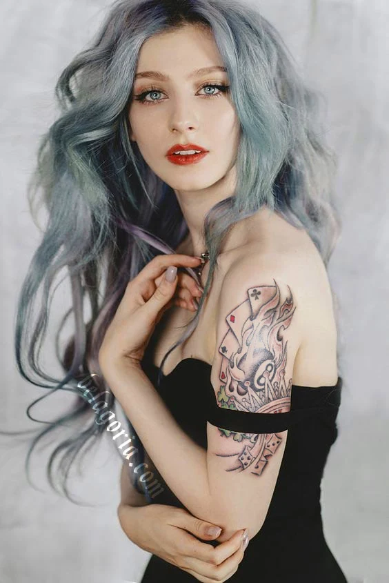 En la imagen de arriba, esta mujer luce tatuaje clásicos de poker con baraja de cartas y los dados