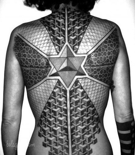 La espalda es una de las partes mas escogidas para realizarse tatuajes geométricos. La razón es evidente, el tamaño y la forma de esta zona de nuestra anatomía.
