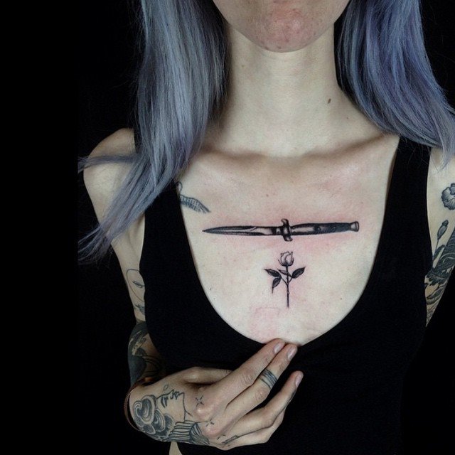 Los tatuajes de cuchillos y puñales pueden ser un buen tema si buscas ideas femeninas No es necesario que escojas grandes diseños, o espectaculares formas para acompañar tu diseño. En el caso de los puñales, el tamaño es lo de menos, lo que importa es el mensaje que intentas enviar. Un dibujo pequeño en la piel, como el de la modelo de arriba, justo en el centro del pecho, puede significar tantas cosas, que la riqueza del simbolismo no puede quedar eclipsado por un diseño demasiado vistoso.