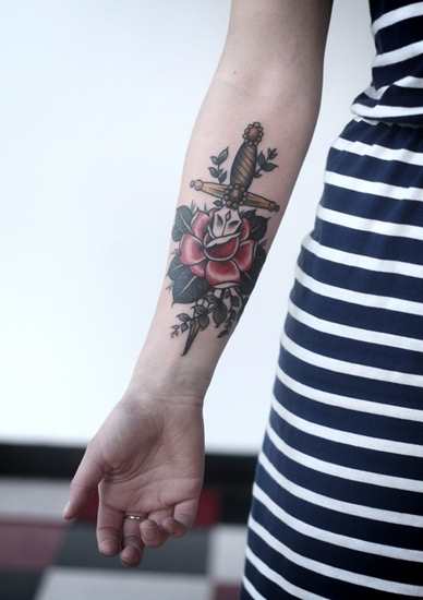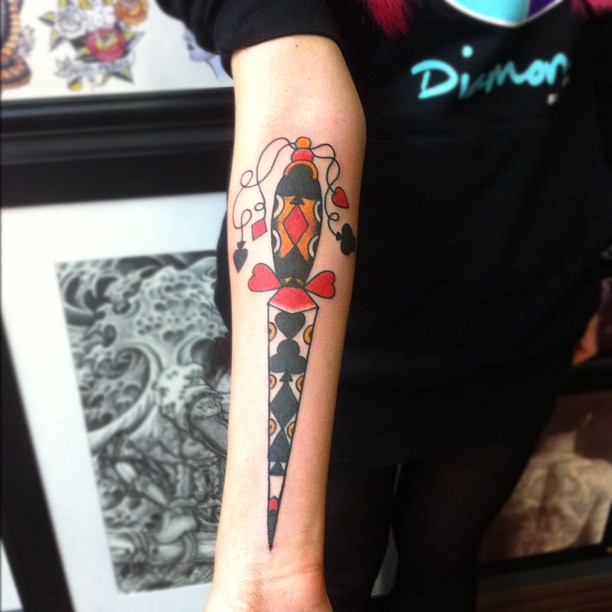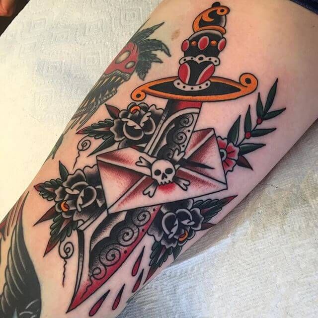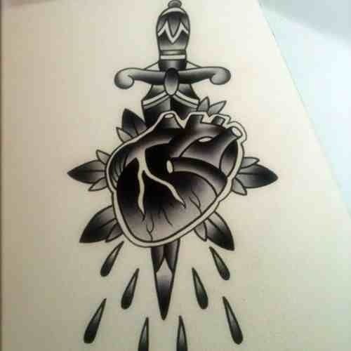 Ten cuidado al colocar el cuchillo en un diseño porque los significados cambian cuando cruza los cuchillos, agrega una serpiente, la tiene en una liga o cerca de una calavera. Esta es una imagen poderosa que realmente te permite expresar su singularidad fácilmente en tinta. El corazón atravesado no hay duda que es uno de los diseños asociados al estilo tradicional mas reconocido.